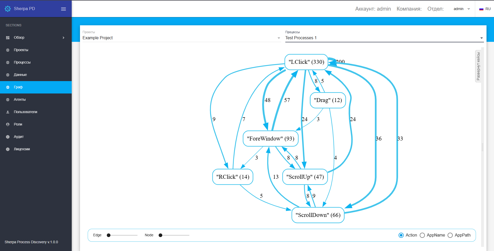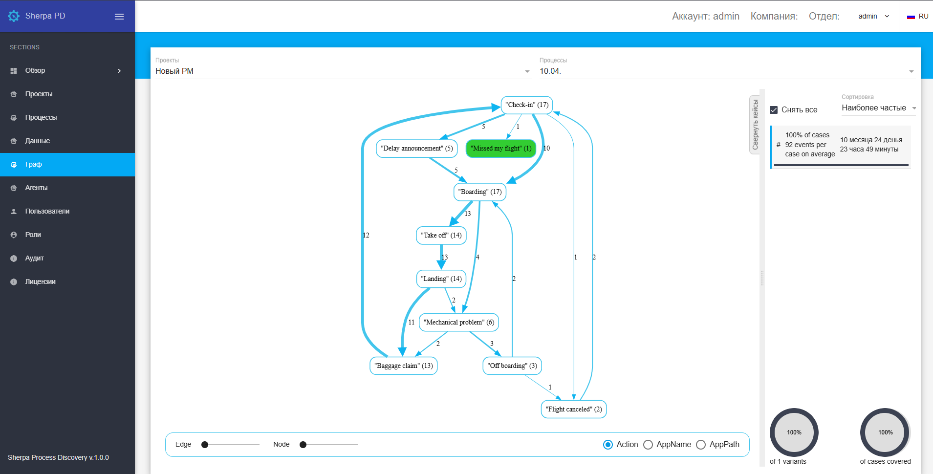 Sherpa Process Discovery выявляет причинно-следственные связи между действиями, которые объединяют их в один устойчивый процесс и строит соответствующую диаграмму бизнес-процесса (граф процесса). На этом этапе появляются списки повторяющихся процессов и их вариации, визуализируются данные в виде BPM-подобных диаграмм процесса со всеми шагами.